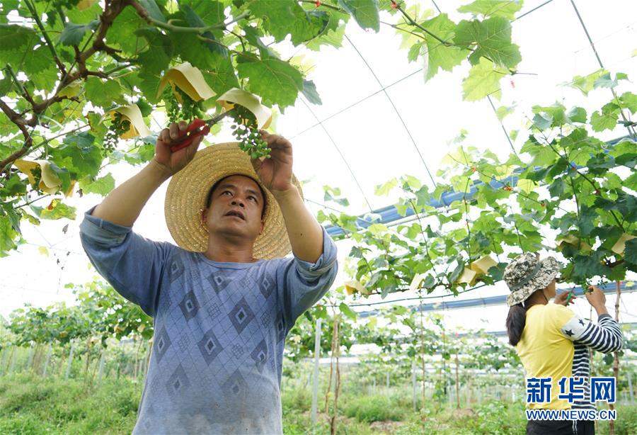 5月13日,在福建省建瓯市小桥镇阳泽村诚源果蔬专业合作社,村民在修剪葡萄枝叶。诚源果蔬专业合作社有葡萄园100多亩,产品供应北京上海市场,村民可以在葡萄园内从事季节性工作。新华社记者贺灿铃摄