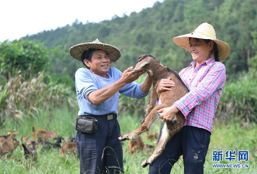 5月13日,在福建省建瓯市小桥镇阳泽村,村民吕元鑫(左)和妻子抱起一只小羊。62岁的吕元鑫曾因病返贫,2016年后通过扶贫贷款从事山羊养殖,现已还清贷款,每年养殖收入两三万元。新华社记者林善传摄