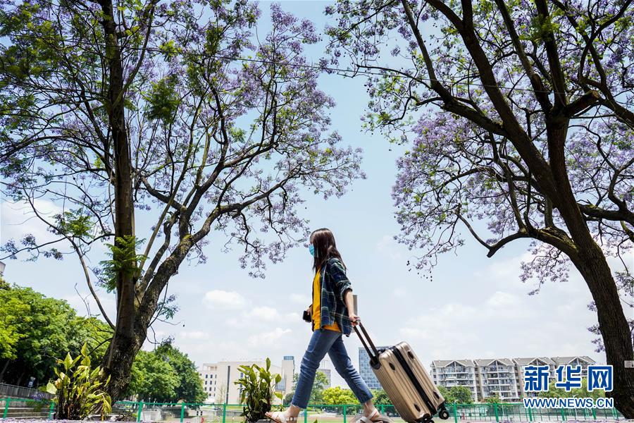 5月15日,西南大学校园内的蓝花楹树下,一名学生拖着行李箱向宿舍走去。当日,重庆西南大学迎来疫情以来首批返校大学生。据介绍,按照疫情防控的需要,重庆市高校2020年春季学期从5月11日起按照“一校一策”原则,实行错峰错时分批次有序开学复课。新华社记者刘潺摄