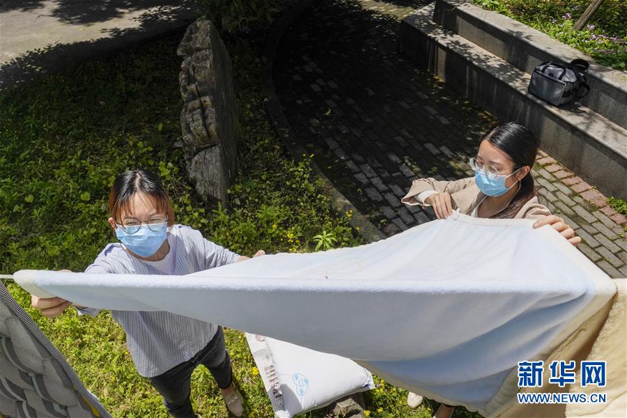 5月15日,在西南大学一栋宿舍楼下,一名返校大学生(左)在辅导员老师的帮助下晒被子。当日,重庆西南大学迎来疫情以来首批返校大学生。据介绍,按照疫情防控的需要,重庆市高校2020年春季学期从5月11日起按照“一校一策”原则,实行错峰错时分批次有序开学复课。新华社记者刘潺摄