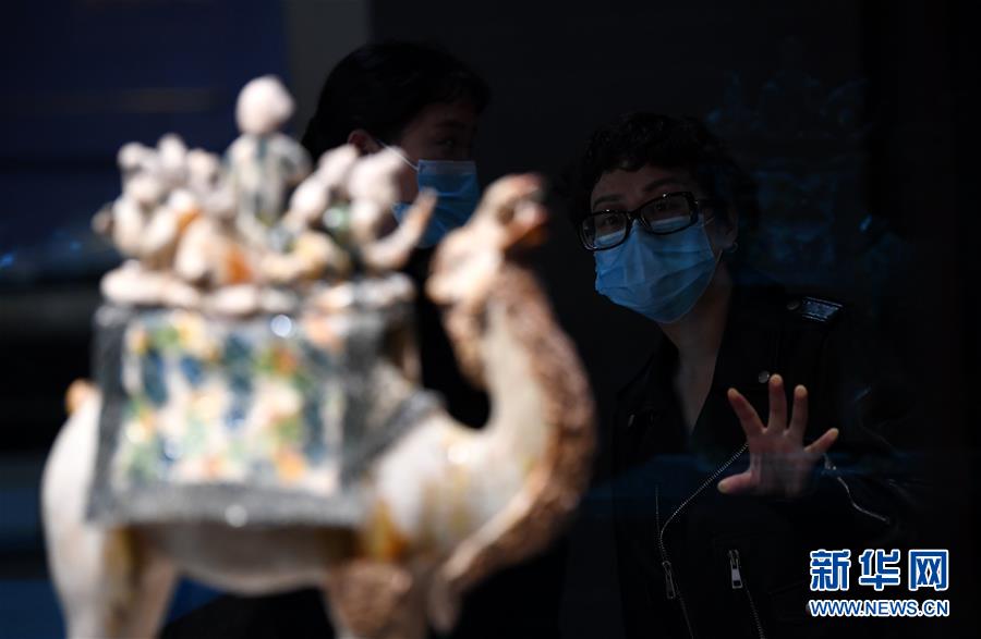 游客在陕西历史博物馆参观唐三彩骆驼载乐俑(3月25日摄)。新华社记者 李一博 摄
