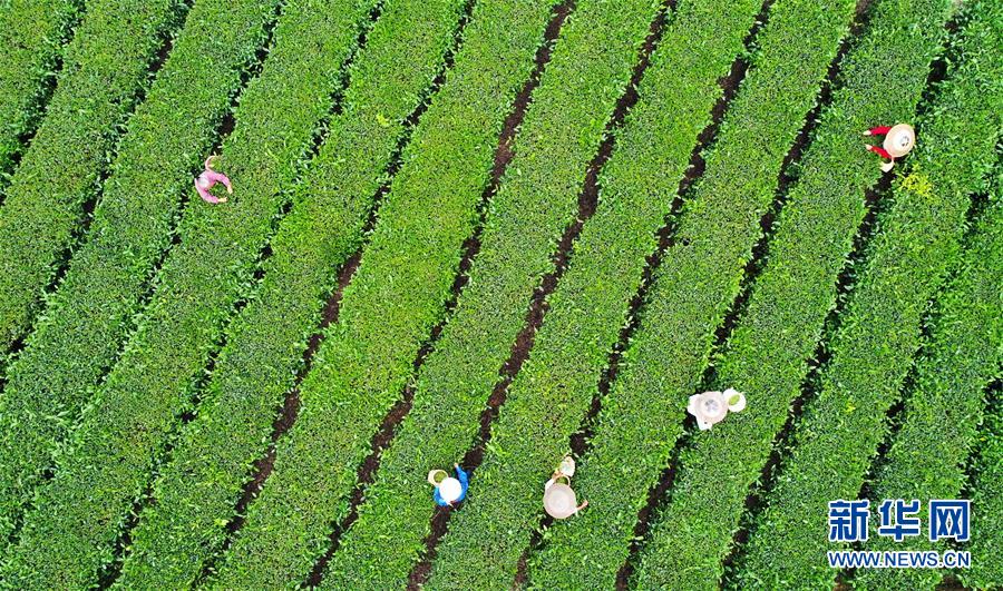 5月17日,村民在新院村茶叶基地采摘夏茶(无人机照片)。新华社记者王全超摄