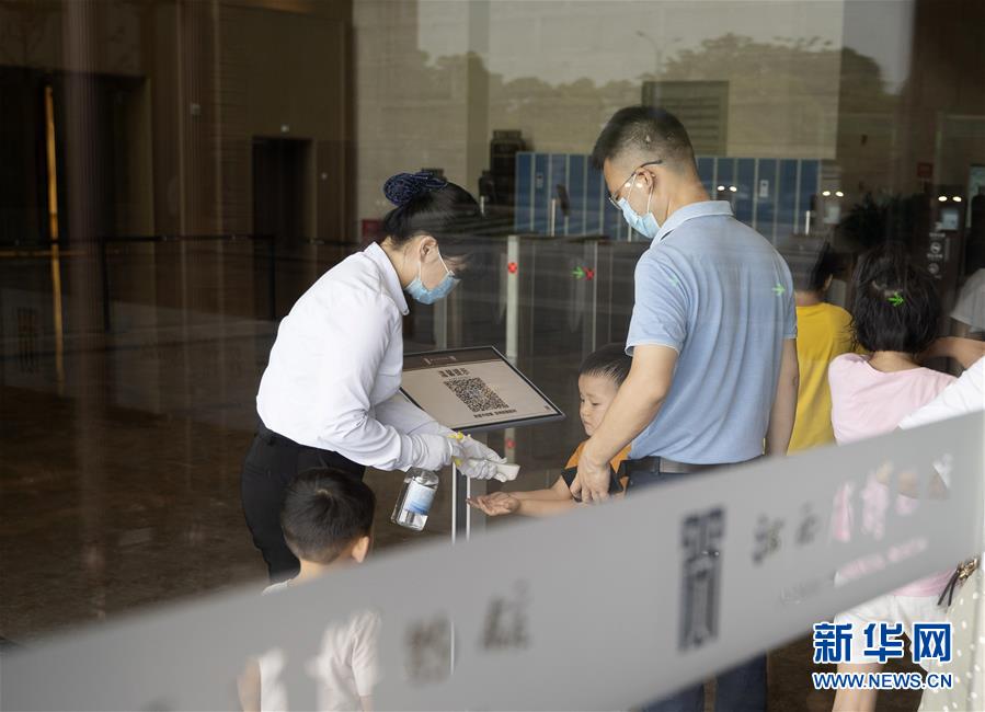 5月17日,在江西省博物馆新馆,参观者入馆前测量体温。江西省博物馆新馆在做好疫情防控的前提下有序开放,公众可通过网上预约参观游览。新华社记者张浩波摄