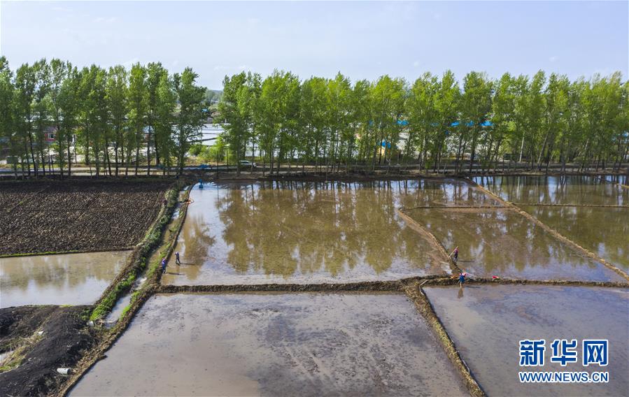 5月17日,在吉林省长春市双阳区徐家村,农民在水稻田间耕作(无人机照片)。新华社记者许畅摄