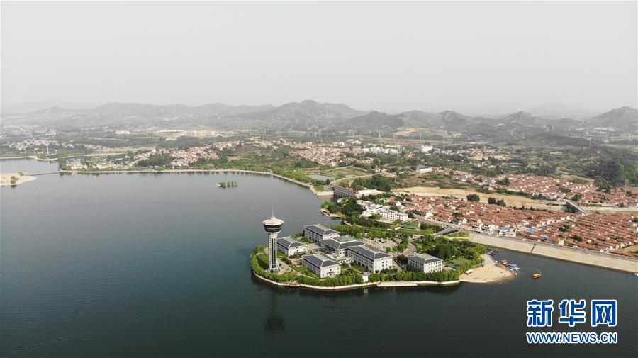 这是5月17日拍摄的雪野湖景色(无人机照片)。山东济南风景区——雪野湖波光粼粼,岸边绿树环抱,加上星星点点的帆船在湖面摇曳,景色宜人。新华社记者王凯摄