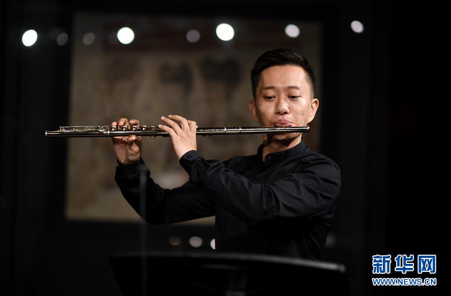 在陕西历史博物馆唐代壁画珍品馆,西安交响乐团长笛首席孙丁为“云上国宝”音乐会彩排(5月14日摄)。为迎接国际博物馆日,5月14日,西安交响乐团走进陕西历史博物馆唐代壁画珍品馆,为5月18日的“云上国宝”音乐会彩排。观众将通过网络直播,在聆听天籁的同时欣赏国之瑰宝,感受艺术与美的和谐共鸣。新华社记者李一博摄