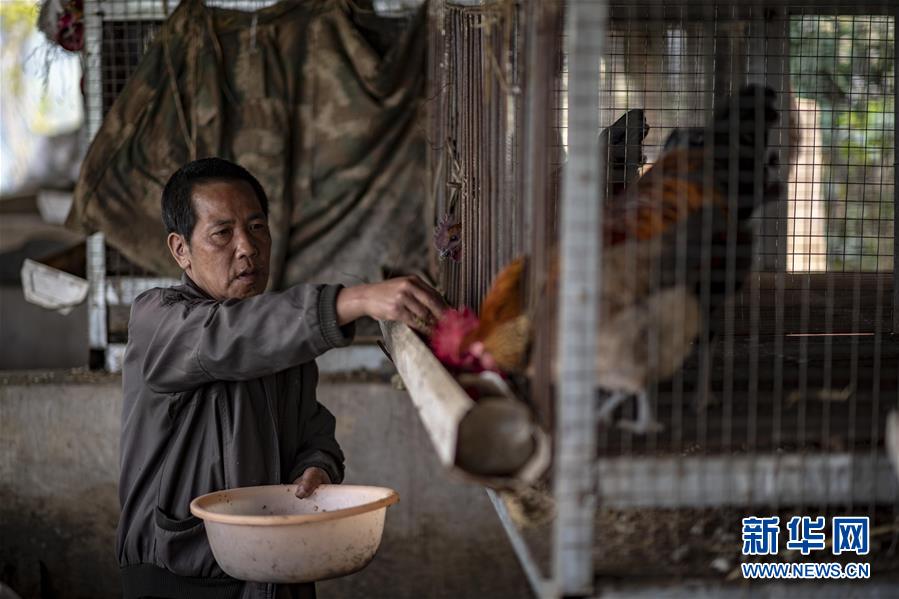 村民在统一修建的鸡舍里喂鸡(3月28日摄)。新华社记者江文耀摄