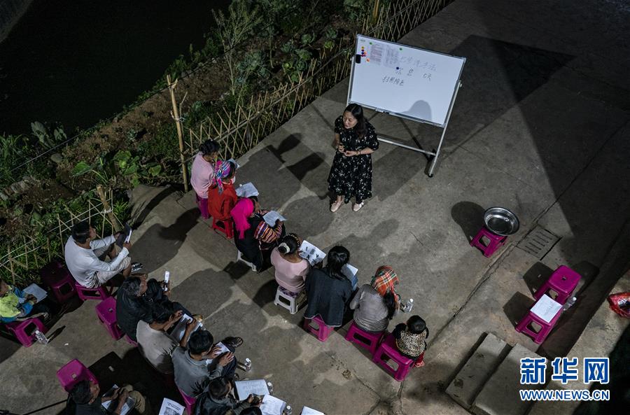 村民们利用夜间空闲时间,在院子里集体学习普通话(3月28日摄)。新华社记者江文耀摄