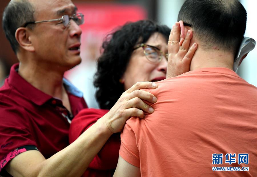 5月18日,李静芝(左)与失散32年的儿子毛寅团聚时落泪。新华社记者张博文摄
