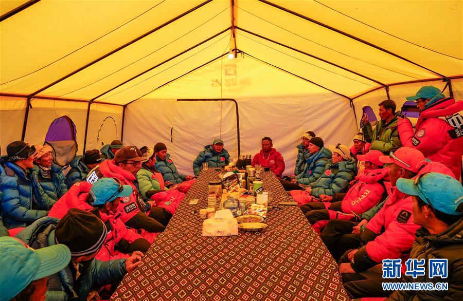 这是在海拔6500米的珠峰前进营地拍摄的公布2020珠峰高程测量12人冲顶队员名单现场(5月18日摄)。新华社特约记者扎西次仁摄