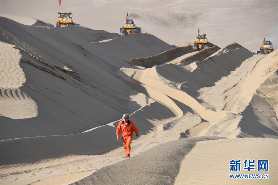 工人李明友在施工现场爬上沙丘(5月16日摄)。新华社记者宋彦桦摄