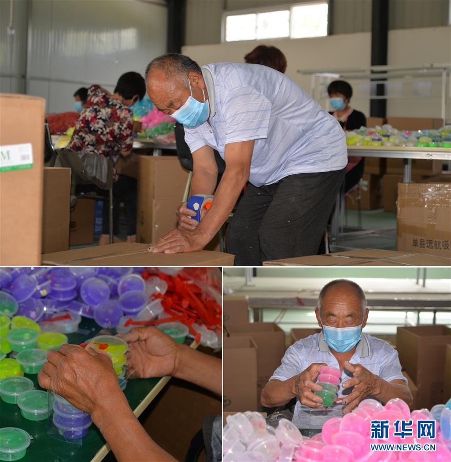 这是一张拼版照片(图片均为5月16日摄)。上图:在河南省开封市尉氏县大桥乡冯村扶贫车间,65岁的郑春岭用胶带把装满玩具的纸箱封上。依靠村内扶贫车间,他走上致富的道路;下左图、下右图:郑春岭在打包玩具。新华社记者孙清清摄