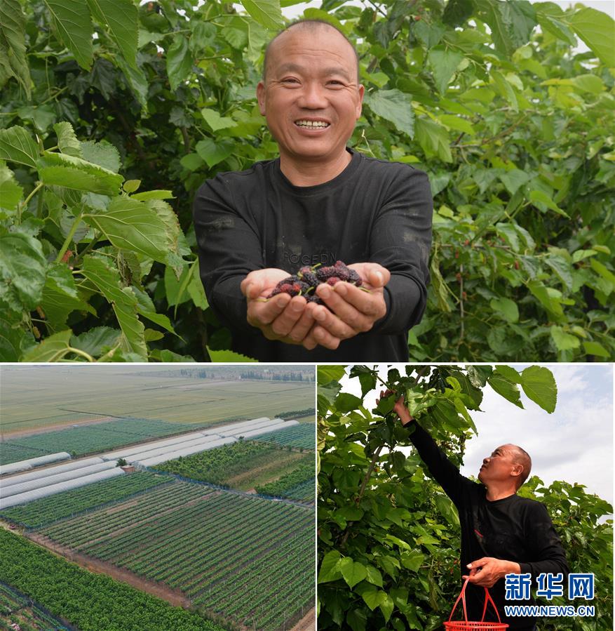 这是一张拼版照片(图片均为5月16日摄)。上图:在河南省开封市尉氏县大桥乡冯村,50岁的文海军在他的黄瓜种植大棚内采摘黄瓜;下左图:在扶贫政策扶持下,文海军盖了占地6亩的蔬菜温室大棚(无人机照片);下右图:文海军驾驶三轮车运输采摘的黄瓜。新华社记者孙清清摄