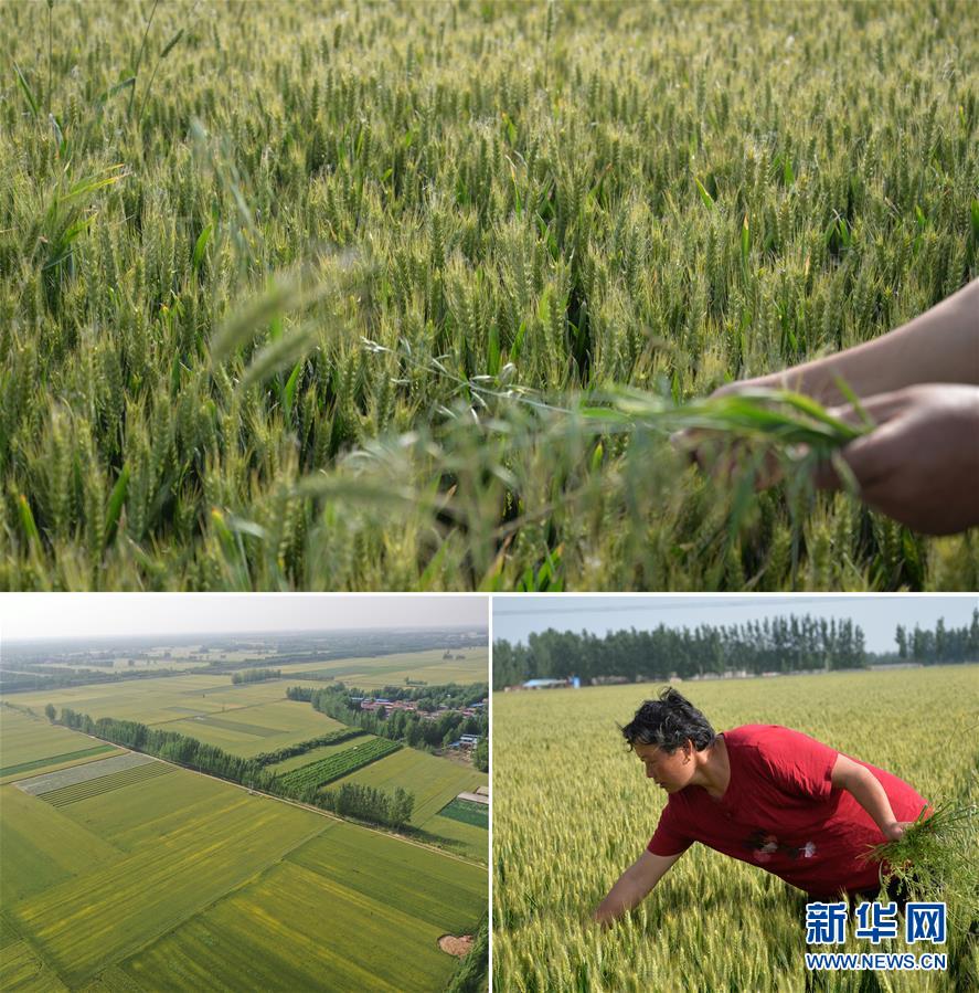 这是一张拼版照片(图片均为5月16日摄)。上图、下右图:在河南省开封市尉氏县十八里镇赵岗村,村民郭菊在麦田内清除杂草。今年她家流转土地种了18亩小麦,长势良好。下左图:尉氏县十八里镇赵岗村附近集中连片的麦田即将迎来收获(无人机照片)。新华社记者孙清清摄
