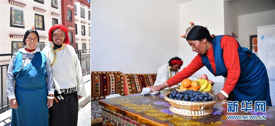 拼版照片:左图为西藏昌都市八宿县拥巴乡娜帕村村民布贡(右)和妻子益西琼措在安置点楼前;右图为在八宿县乃然易地扶贫搬迁安置点,益西琼措在家里打扫卫生。2018年,布贡一家人搬迁到乃然易地扶贫搬迁安置点,住进了三室一厅的新居。和布贡一家一样,八宿县拥巴乡、夏里乡、瓦乡的2000余名群众完成易地搬迁,开启美好的新生活(5月10日摄)。新华社记者詹彦摄