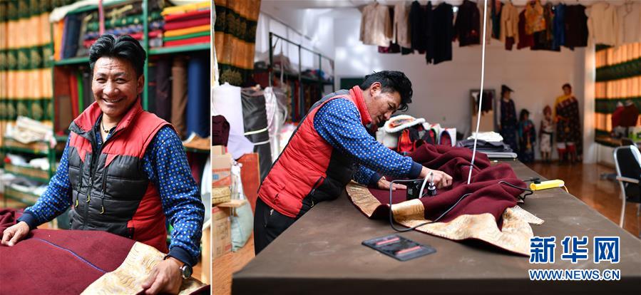 拼版照片:左图为西藏昌都市江达县字嘎乡塔字村村民扎西江措;右图为扎西江措在西藏昌都市江达县格桑花民族服饰加工销售公司制作藏装。扎西江措学习藏装缝制不到两年时间,已经是一名熟练的制衣工,现在月收入4000多元。在此之前,扎西江措靠放牧、四处打零工养活一家人(4月30日摄)。新华社记者詹彦摄
