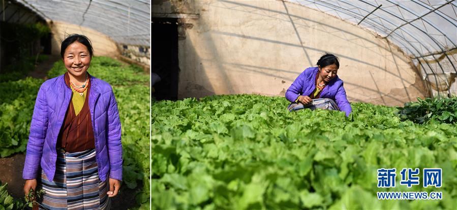 拼版照片:左图为西藏昌都市左贡县旺达镇列达村村民阿旺拉珍;右图为阿旺拉珍在左贡县旺达镇列达村的蔬菜大棚里忙碌。近年来,列达村大力发展蔬菜产业,建起温室大棚30座,按照每4户1座大棚的模式进行种植、管理和销售。阿旺拉珍在大棚里种了白菜、辣椒和白萝卜,一年收入近万元(5月7日摄)。新华社记者詹彦摄