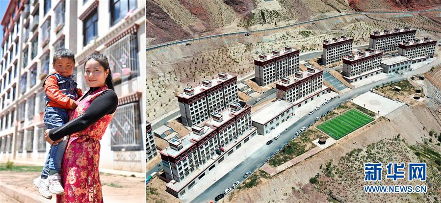 拼版照片:左图为西藏昌都市八宿县夏里乡吉热村村民次日措姆和儿子加拥罗布在安置点楼前;右图为八宿县乃然易地扶贫搬迁安置点一角(无人机照片)。2018年,次日措姆和家人搬迁到乃然易地扶贫搬迁安置点,住进了75平方米的新居。次日措姆还在安置点找到一份保洁员工作,每月有1900元的收入 (5月10日摄)。新华社记者詹彦摄