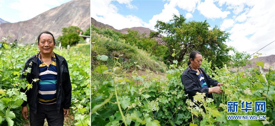 拼版照片:左图为西藏昌都市芒康县木许乡阿东村村民杨培;右图为杨培在葡萄园里忙碌。近年来,芒康县大力发展葡萄种植,成为群众脱贫增收的“甜蜜”产业。杨培在村里种了3.5亩葡萄,2019年出售葡萄赚了8000多元。以前,杨培只种青稞和玉米,除了自给自足,几乎没有经济收益(5月6日摄)。新华社记者詹彦摄