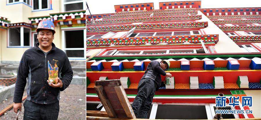 拼版照片:左图为西藏昌都市卡若区卡若镇卡若村村民洛松郎直;右图为洛松郎直在昌都市一处建筑工地进行外墙彩绘作业。洛松郎直从小就喜欢画画,由于家境贫寒,初中毕业后,他回到家里干农活、放牧,挑起家庭重担,但一直没有放弃画画的梦想。后来,洛松郎直前往卡若区拉多乡学习唐卡绘画,技艺得到很大提高。2017年,洛松郎直为卡若区一个周转房建设项目绘制墙体彩绘。2018年,在村里的支持下,洛松郎直创办了公司,承揽更多的藏式墙体彩绘工程(4月30日摄)。新华社记者詹彦摄