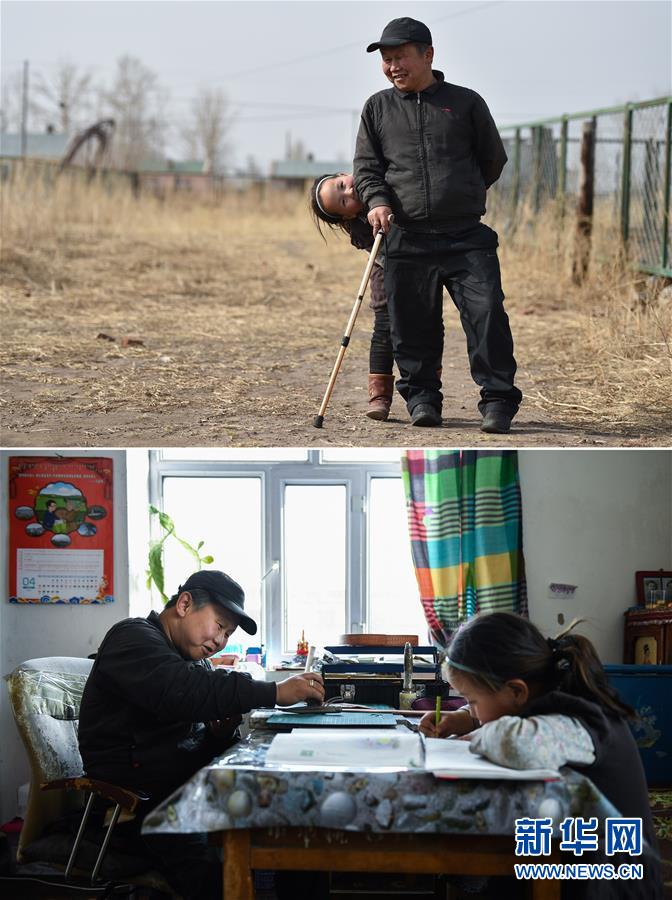 拼版照片上图:在锡尼河镇的出租房外,米格木尔(前)和女儿南吉乐玛一起玩耍;下图:在锡尼河镇的出租房内,米格木尔在进行皮雕,女儿南吉乐玛在温习功课(照片均摄于4月15日)。2016年,家住内蒙古鄂温克族自治旗锡尼河镇孟根础鲁嘎查的米格木尔因为缺失劳动能力成了建档立卡贫困户。独自抚养女儿的他为了女儿上学离开了牧区来到镇上租房陪读,生活的压力让米格木尔犯了难。2018年春天,他通过当地民族文化产业创业园举办的皮雕手艺培训,让他居家赚钱、陪读两不误,逐步实现稳定脱贫。2020年4月,我国第一个成立的少数民族自治区——内蒙古自治区宣告全面脱贫“摘帽”。党的十八大以来,我们坚持以人民为中心的发展思想,明确了到2020年我国现行标准下农村贫困人口实现脱贫、贫困县全部摘帽、解决区域性整体贫困的目标任务。目前看,脱贫进度符合预期,成就举世瞩目。这些成绩的取得,凝聚了全党全国各族人民智慧和心血,是广大干部群众扎扎实实干出来的。脱贫摘帽不是终点,而是新生活、新奋斗的起点。新华社记者刘磊摄