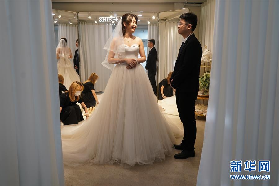5月19日,江苏省人民医院重症医学科医生王魏魏(中)在试婚纱。她曾在武汉两家医院的重症病区奋战45天。当日,15对新人在江苏南京集体拍摄婚纱照,并将参加5月20日在南京举行的“今世缘白衣天使集体婚礼”。拍摄婚纱照的部分新人此前因驰援武汉或参加所在城市抗疫工作而推迟婚期。新华社记者季春鹏摄