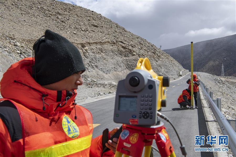 国测一大队队员在日喀则市定日县曲当乡境内进行水准测量(4月18日摄)。新华社记者孙非摄