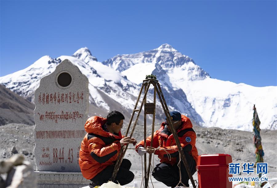 国测一大队队员在珠峰大本营附近测试设备(5月17日摄)。新华社记者普布扎西摄