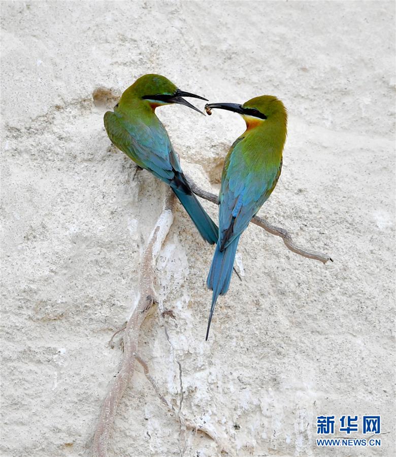 这是5月19日在厦门五缘湾栗喉蜂虎自然保护区拍摄的两只栗喉蜂虎。近日,大批栗喉蜂虎来到厦门五缘湾栗喉蜂虎自然保护区栖息、繁殖。新华社记者魏培全摄