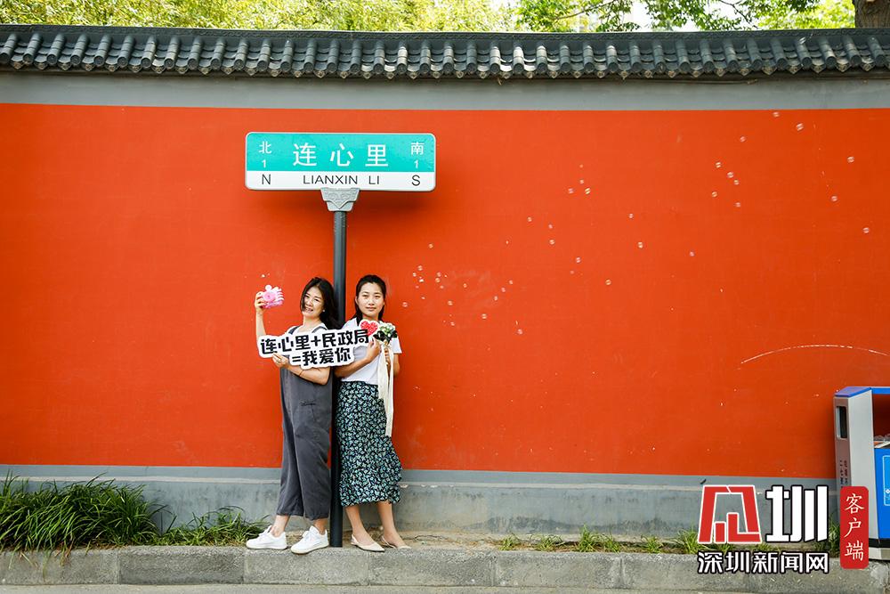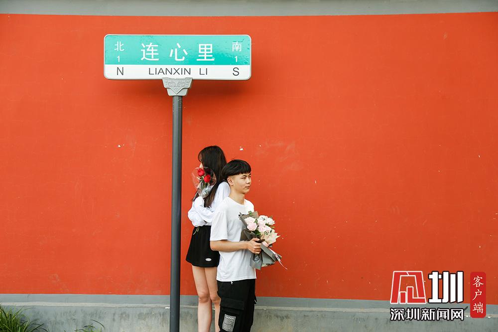 不过,在5月20日当天来这里拍照的情侣或夫妻并不多,反倒有众多“单身狗”与同性闺蜜一起,在“连心里”的路牌下、红墙边,手捧鲜花拍照打卡。
