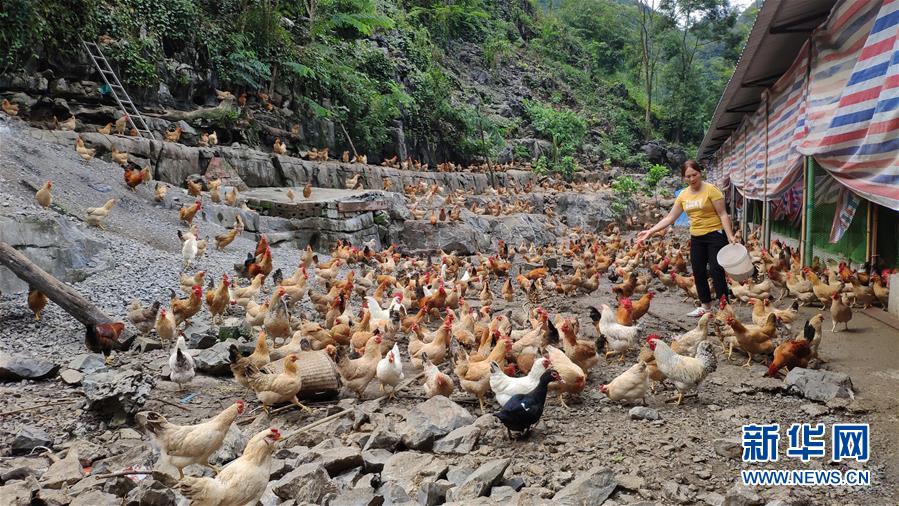 大化瑶族自治县雅龙乡胜利村一名群众在喂养“七百弄鸡”(2019年9月11日摄)。新华社记者张爱林摄
