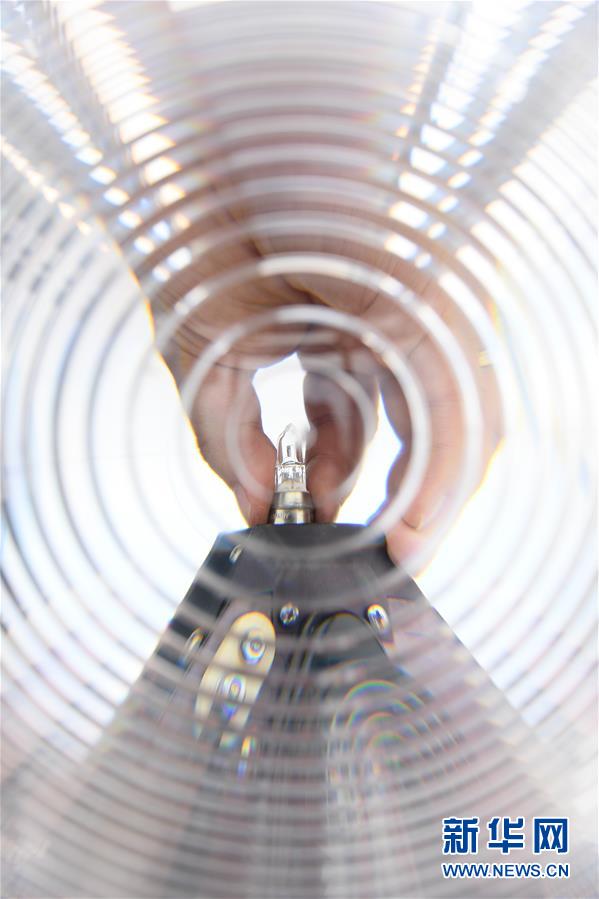 5月20日,在宁波七里屿灯塔上,叶家第五代灯塔工叶超群在更换破损的灯泡。叶超群自2013年起在七里屿灯塔工作。新华社记者翁忻旸摄