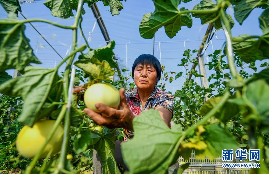 5月20日,新河县寻寨镇桃园村村民在采摘甜瓜。近年来,河北省新河县寻寨镇在推进农业供给侧结构性改革中,把甜瓜种植作为扶贫产业项目。村集体把部分闲置的土地流转给本村有就业能力的贫困户,并引导他们规模化种植甜瓜,带动群众脱贫增收。新华社记者王晓摄