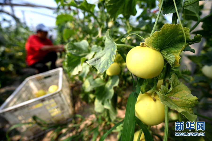 5月20日,新河县寻寨镇桃园村村民在采摘甜瓜。近年来,河北省新河县寻寨镇在推进农业供给侧结构性改革中,把甜瓜种植作为扶贫产业项目。村集体把部分闲置的土地流转给本村有就业能力的贫困户,并引导他们规模化种植甜瓜,带动群众脱贫增收。新华社记者王晓摄