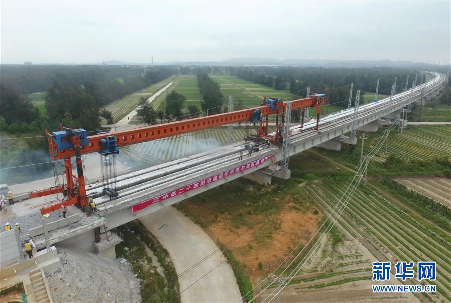 5月20日,福平铁路洋中特大桥最后一片T型梁在架设中。新华社记者林善传摄