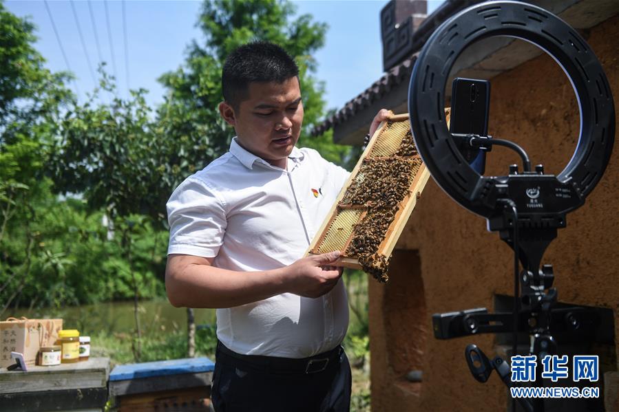 5月20日,长兴县林城镇畎桥村的意蜂蜂业帮扶基地内,养蜂能手邱凯在进行网上直播,介绍当地蜜蜂养殖特色及相关蜂产品。新华社记者徐昱摄