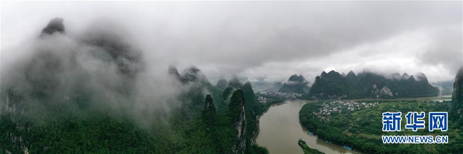 这是在广西桂林市阳朔县兴坪镇拍摄的山水风光(5月21日摄,无人机全景照片)。“苍苍森八桂,兹地在湘南。江作青罗带,山如碧玉篸……”一千多年前,唐朝诗人韩愈写尽桂林山水之美。初夏时节,在广西桂林市阳朔县兴坪镇,蓝天白云下,烟雨朦胧中,桂林山水尽显秀美。新华社记者周华摄