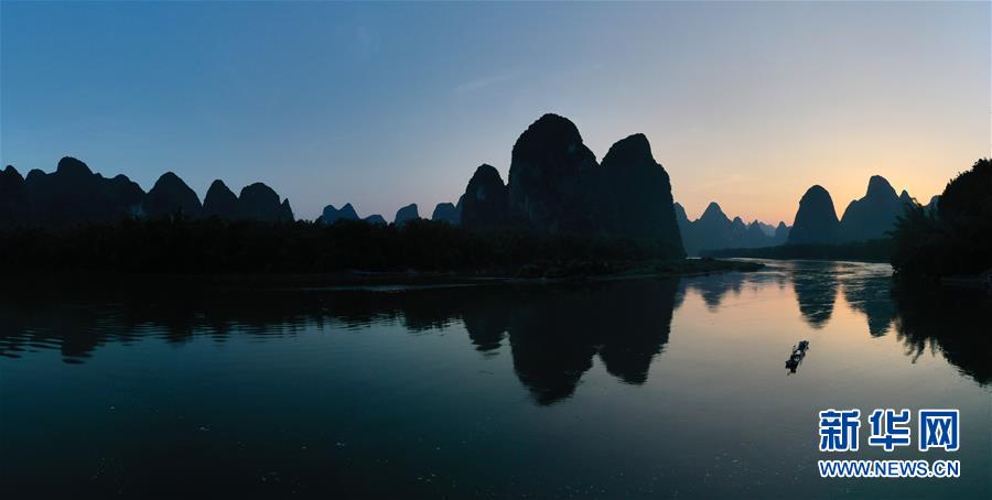 这是在广西桂林市阳朔县兴坪镇拍摄的山水风光(5月19日摄,无人机全景照片)。“苍苍森八桂,兹地在湘南。江作青罗带,山如碧玉篸……”一千多年前,唐朝诗人韩愈写尽桂林山水之美。初夏时节,在广西桂林市阳朔县兴坪镇,蓝天白云下,烟雨朦胧中,桂林山水尽显秀美。新华社记者 周华 摄