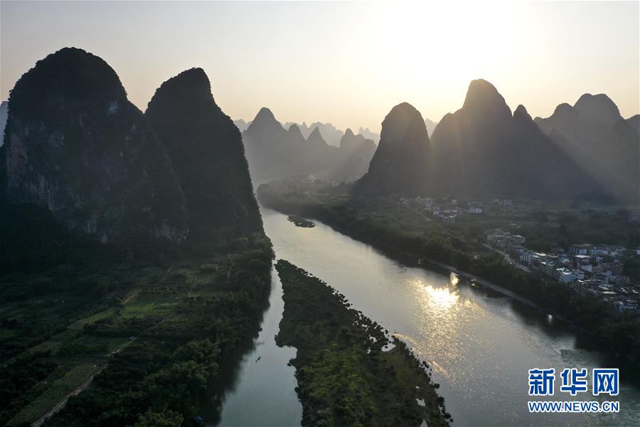 这是在广西桂林市阳朔县兴坪镇拍摄的山水风光(5月19日摄,无人机照片)。“苍苍森八桂,兹地在湘南。江作青罗带,山如碧玉篸……”一千多年前,唐朝诗人韩愈写尽桂林山水之美。初夏时节,在广西桂林市阳朔县兴坪镇,蓝天白云下,烟雨朦胧中,桂林山水尽显秀美。新华社记者 曹祎铭 摄