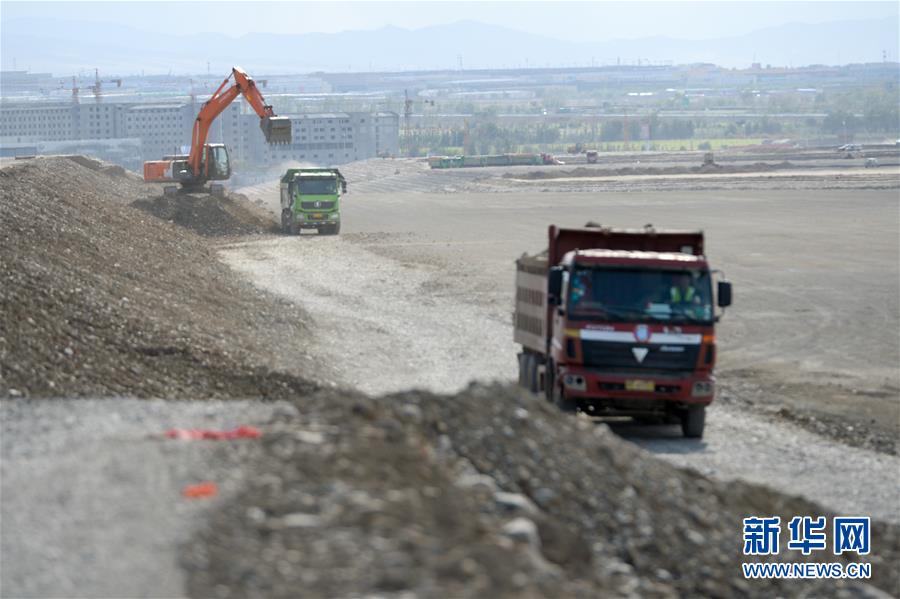 5月23日,在乌鲁木齐机场改扩建工程施工现场,施工车辆在飞行区进行土方回填作业。新华社记者丁磊摄