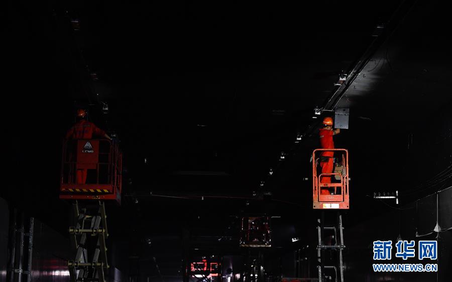 5月23日,工人在海口文明东越江通道项目隧道内安装照明设备。新华社记者杨冠宇摄