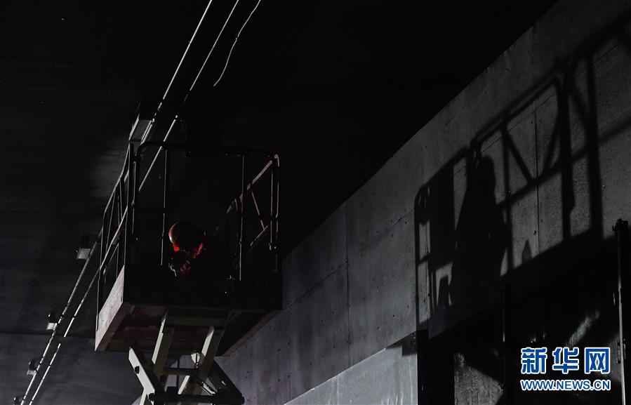 5月23日,工人在海口文明东越江通道项目隧道内安装照明设备。新华社记者杨冠宇摄