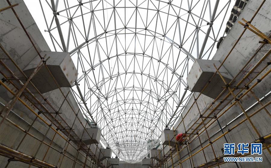 5月23日,工人在海口文明东越江通道项目江西段主线出入口施工。新华社记者杨冠宇摄
