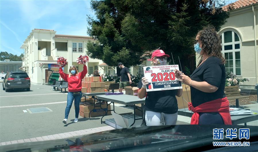 5月22日,在美国加州北部圣马特奥县,人们欢迎来办理毕业手续的学生。新华社记者吴晓凌摄
