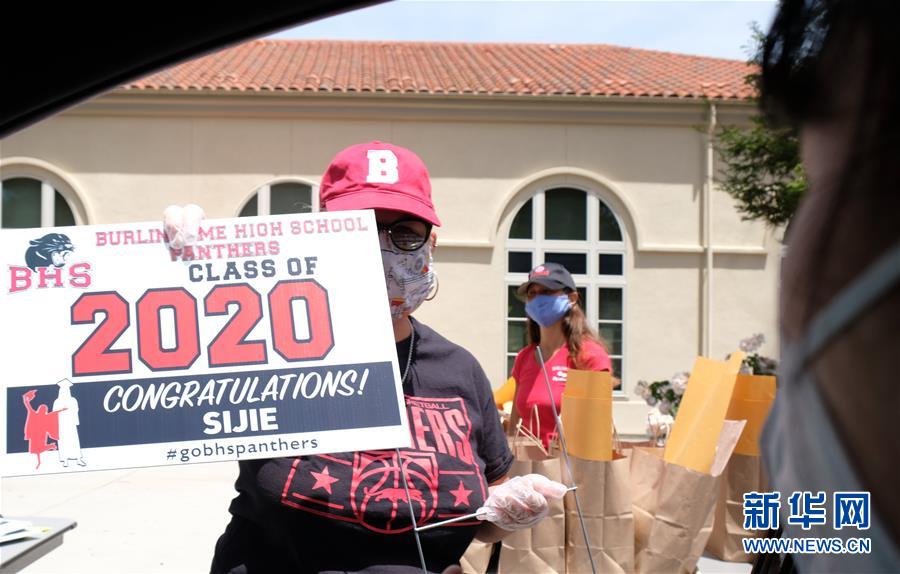5月22日,在美国加州北部圣马特奥县,工作人员欢迎来办理毕业手续的学生。新华社记者吴晓凌摄