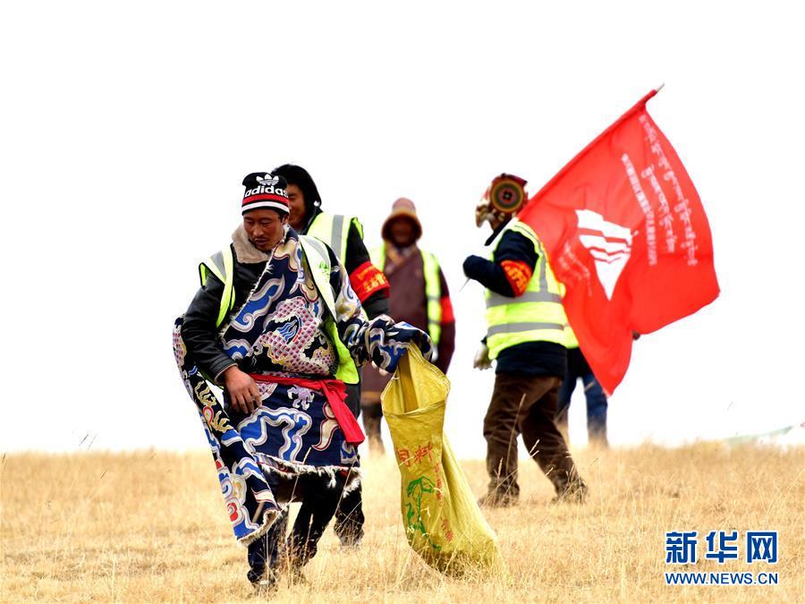 在三江源国家公园黄河源园区,扎陵湖乡生态保护站勒那村生态管护队第七组的队员在捡拾垃圾(2018年12月2日摄)。