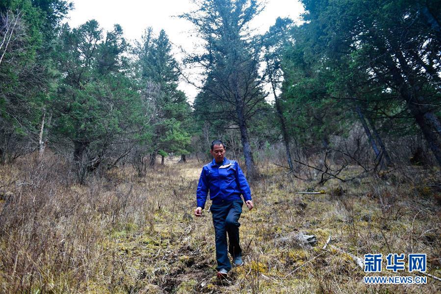 在青海省果洛藏族自治州班玛县境内的玛可河林区,玛可河林场护林员朱福海在巡查(2019年11月12日摄)。新华社记者张龙摄