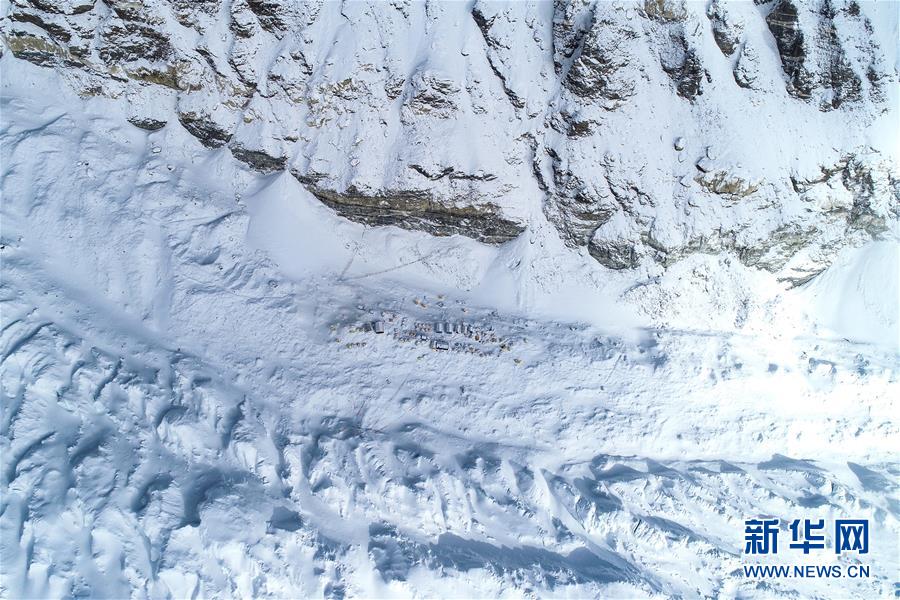 位于珠峰东绒布冰川旁海拔6500米的珠峰前进营地(5月22日摄,无人机照片)。
