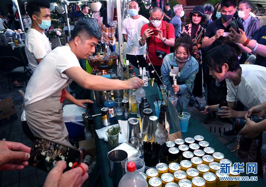 5月24日,调酒师在上海思南公馆露天夜市进行网络直播。入夏以来,上海思南公馆推出“思南夜派对”夜间经济大排档,包括生活市集、深夜食堂、夜游露天博物馆等板块,汇集了国潮品牌、创意美食、艺术衍生品等摊位,为公众带来一站式夜间休闲“加油站”,促进夜间消费。新华社记者陈飞摄