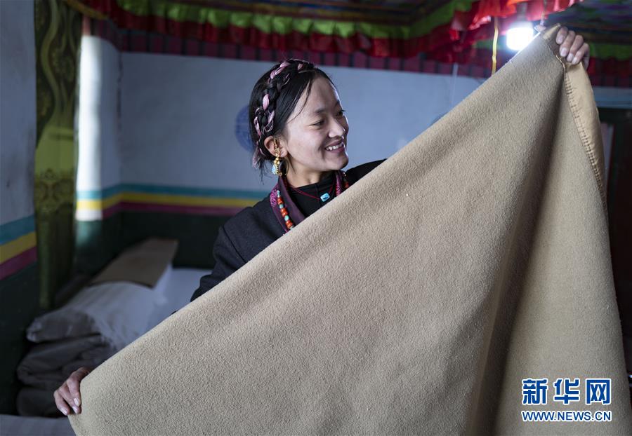 “牛头旅馆”老板多吉的儿媳在旅馆里整理被褥(5月17日摄)。新华社记者普布扎西摄